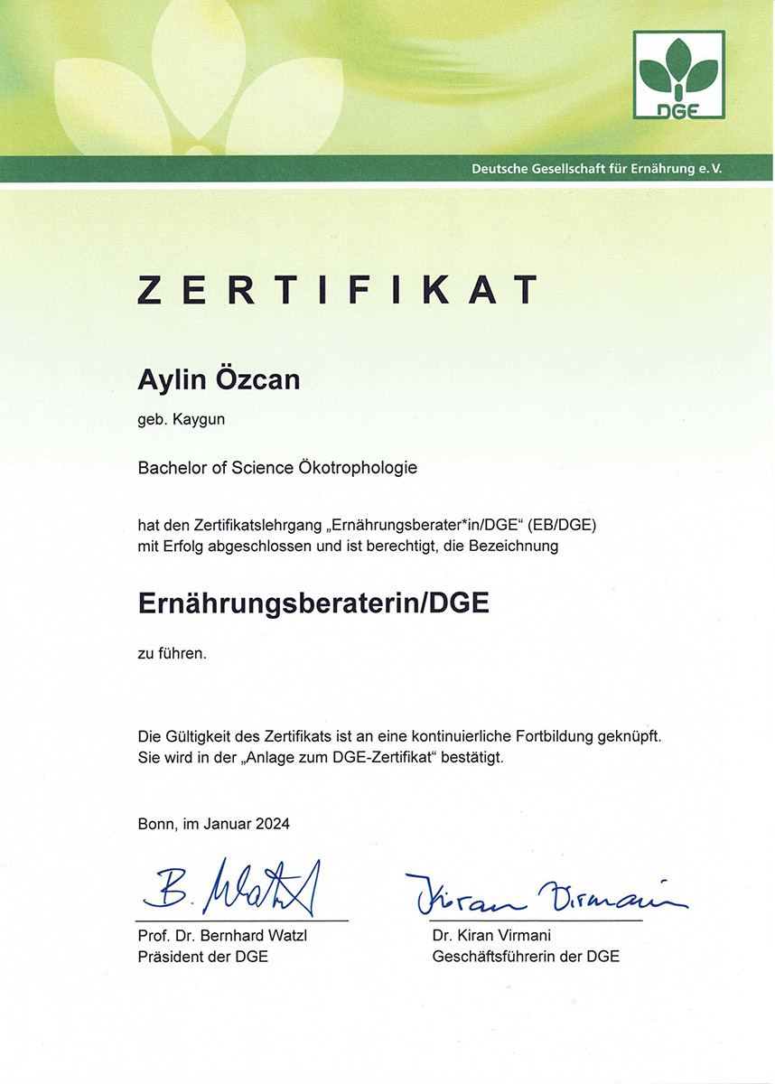 Durch meine regelmäßigen Re-Zertifizierungen der Ernährungsberaterin/ DGE wird meine Beratung von den Krankenkassen anerkannt, sodass Sie die Kosten erstatten lassen können.
